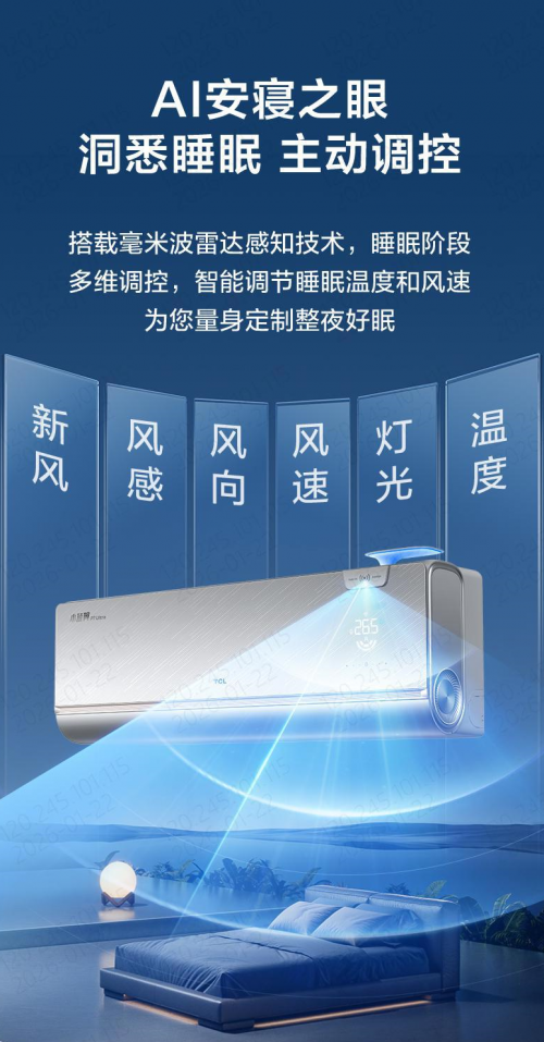《中国睡眠研究报告2025》显示,我国超5亿人受困于入睡难、易醒等睡眠问题,而环境温度波动、空气污浊是干扰睡眠的核心因素。TCL小蓝翼P7 Ultra AI健康空调联合中国睡眠研究会深入研究,聚焦“热舒适、声舒适、光舒适、风舒适、空气品质舒适”五大睡眠要素,以安寝之眼睡眠科技实现从“被动控温”到“主动守护深睡”的跨越。