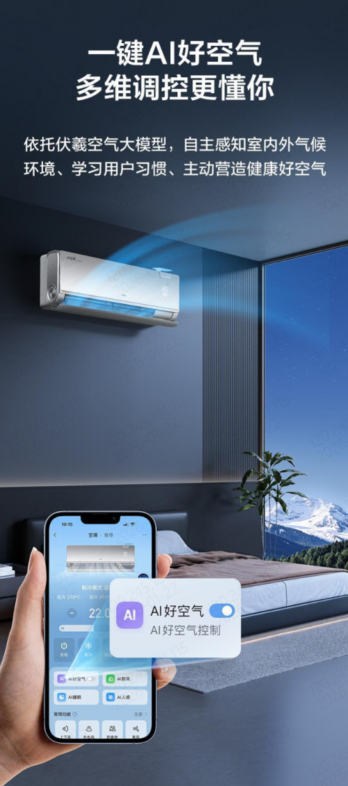 其中一键 AI 好空气功能依托伏羲空气大模型,能自主感知室内外气候环境,学习用户使用习惯,主动营造适配的健康空气环境。智柔风 5.0 技术通过左右扫风打孔叶片和双层柔风环导风板,根据环境温差自动调控柔风模式,彻底告别直吹不适,让送风更柔和、体感更舒适。