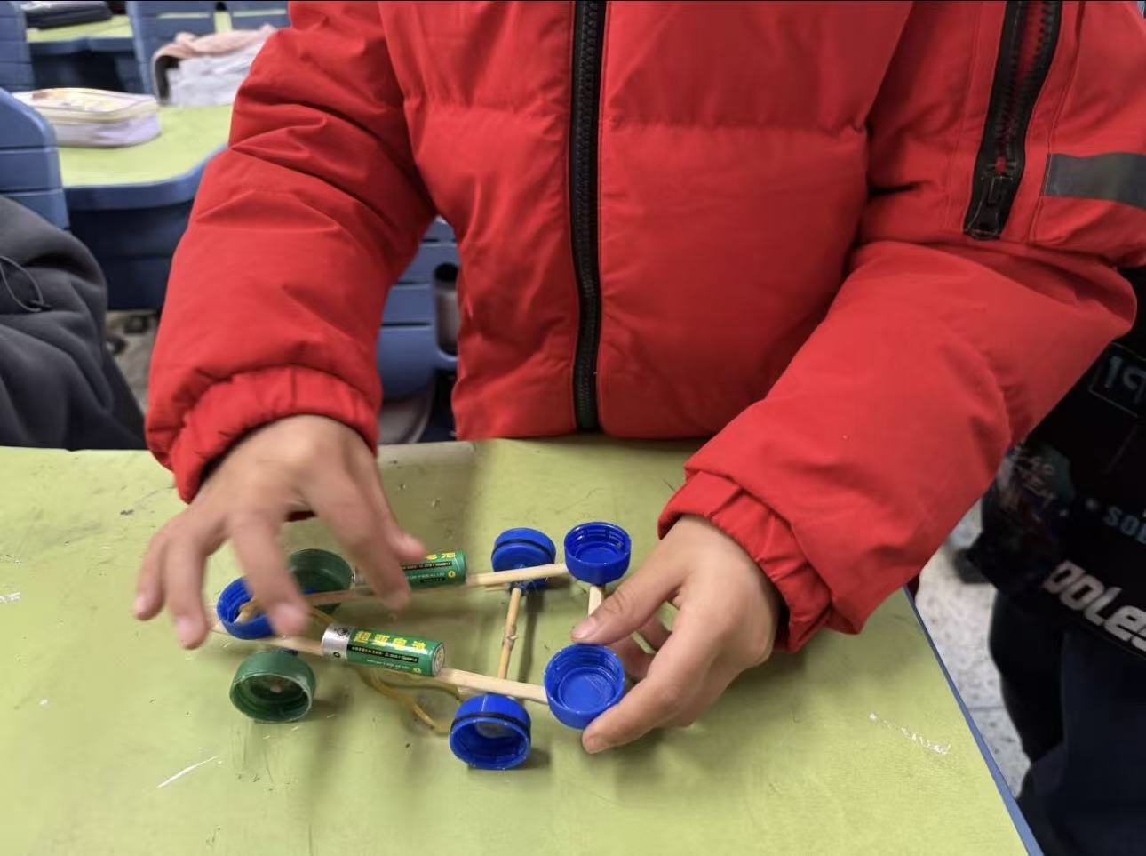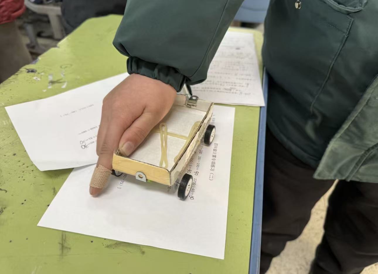 活动中,大家各显神通:有的同学用切割木板拼接出炫酷的电动赛车,精巧的结构里藏着电路驱动的奥秘;有的同学用废旧纸箱制作出简约牢固的小车,环保理念与动手能力完美结合;还有的同学用瓶盖和木棍搭建出别致的小车模型,更有同学带来了气球动力车,随着气球中的气体喷出,小车飞速前进,引来阵阵欢呼。