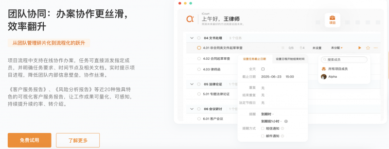 “案件进度到哪了?”“关键节点会不会延误?”这是传统律所管理者的高频疑问,也是律师的日常困扰。手动跟踪案件、依赖口头汇报的模式,不仅耗时耗力,更易导致信息滞后、遗漏关键期限。Alpha法律系统直击这一痛点,以案件管理模块为核心,实现项目全流程线上化、节点化管控。从立案受理、证据梳理、文书起草,到庭审准备、结案归档,每一个环节都清晰呈现在线上平台。系统可自动生成动态进度表,实时同步案件状态,同时设置智能提醒功能,针对举证期限、开庭日期等关键节点主动预警。无论是管理者想要总览全所案件负荷、精准调配资源,还是律师规划个人待办、规避期限风险,都能通过系统一键实现。这种从“黑箱操作”到“全流程透视”的转变,让项目推进更有序,团队协同更主动。