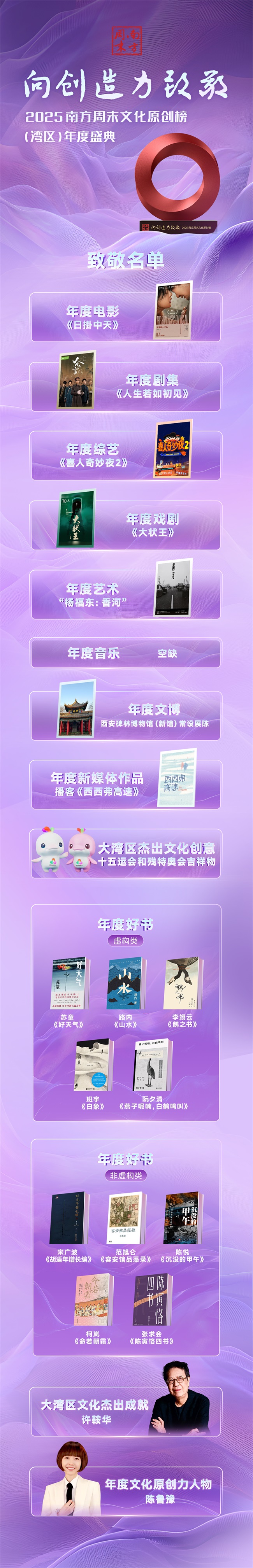 致敬原创力量,记录文化进程。2026年1月24日下午,南方周末文化原创榜(湾区)年度盛典在广州·鹏瑞1号湾颂艺术中心举办,向2025年具有创新力、洞察力和生命力的作品、创作者致敬。活动现场,各项荣誉悉数揭晓。