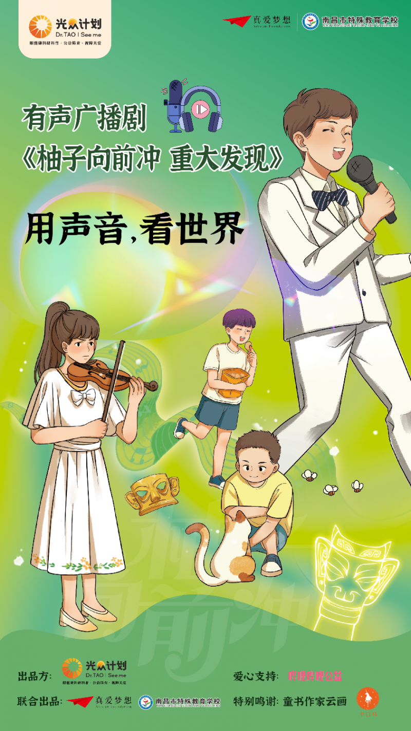 2026年1月底,由陶勇医生发起的公益项目“光盲小主播 第六期”正式结项。南昌市特殊教育学校的43名视障儿童经过系统培训,最终10位“光盲小主播”走进专业录音棚,在录音导演的指导下,完成有声广播剧《柚子向前冲 重大发现》的录制,用声波构建出一个充满童趣和活力的世界。