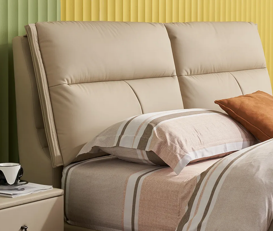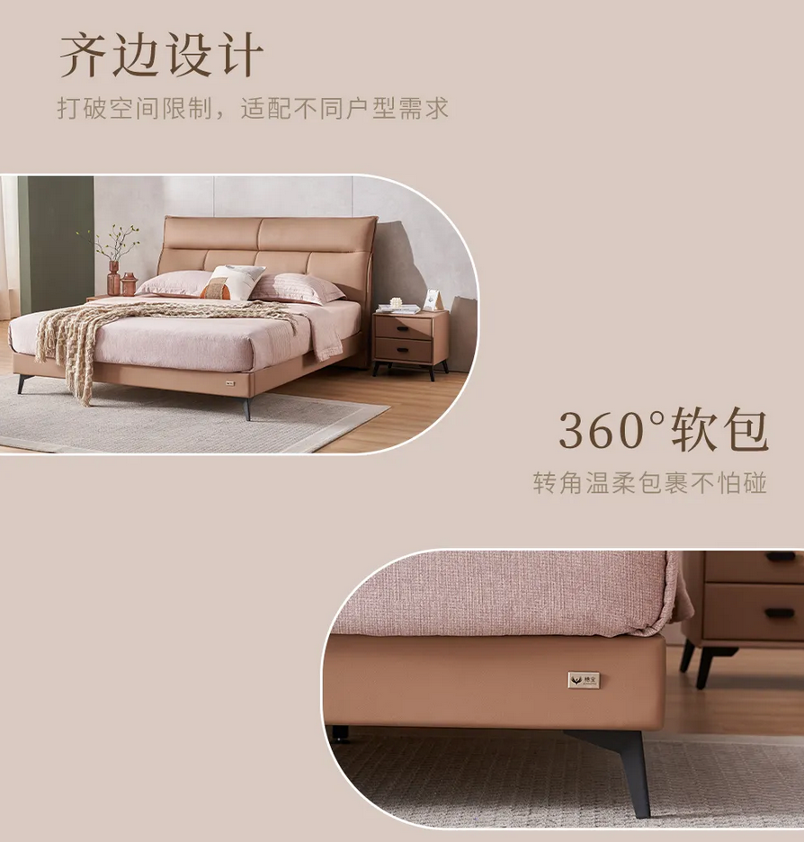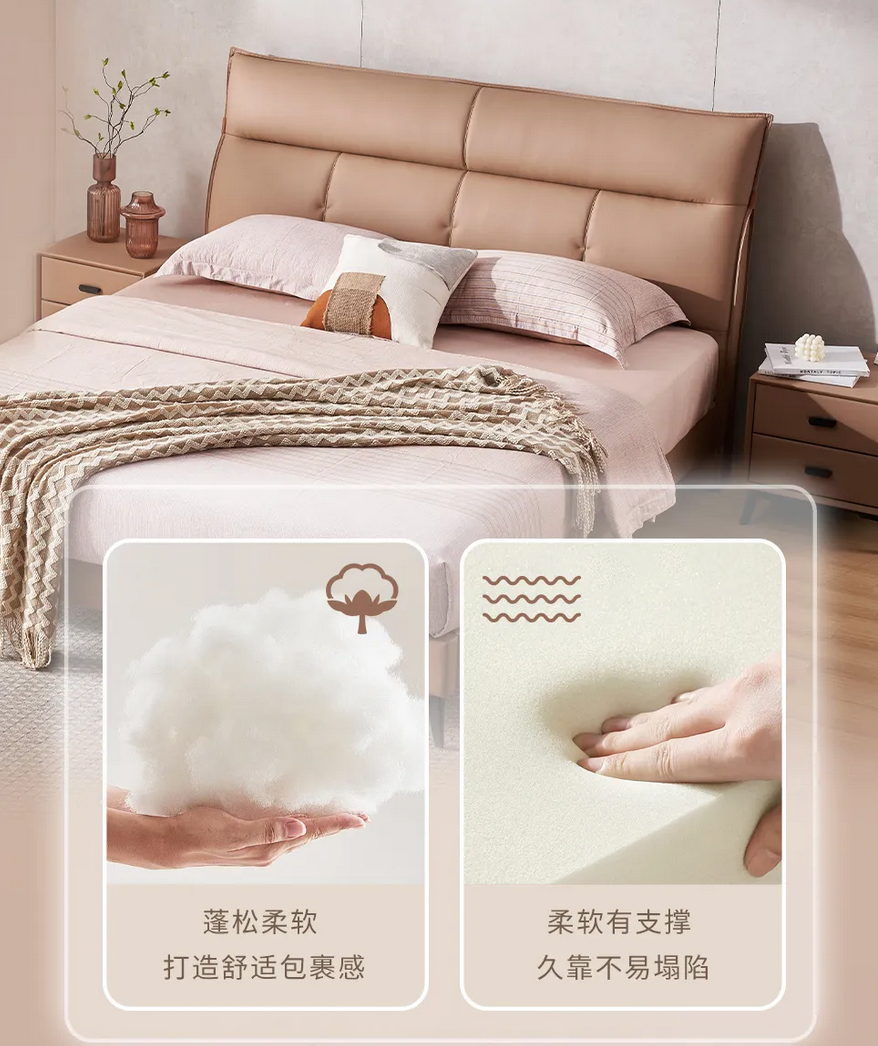 在材质甄选上,梵洛贝同样精益求精。外层采用头层黄牛皮胚打造,严选疤痕少、皮质紧实的优质皮料,最大程度保留牛皮的天然质感,让床体外观饱满立体,触感柔软细腻。内层则创新搭配7孔纤维棉与高密度海绵,双材质结合让靠包整体蓬松柔软,即便长期倚靠也不易塌陷,完美兼顾实用性与舒适感。