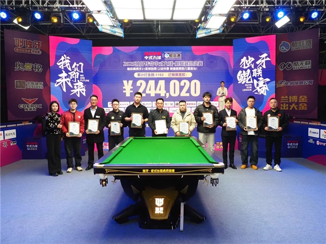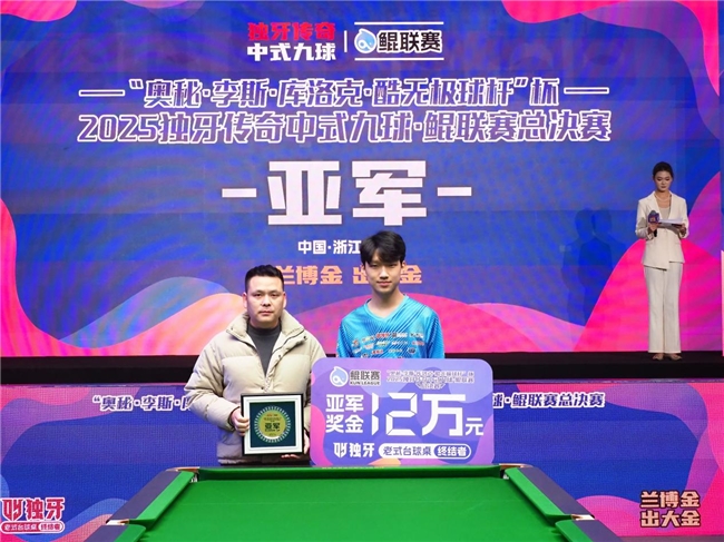 众所周知,在中式九球中,打出大金、小金的瞬间最能点燃赛场激 情。本次独牙传奇鲲联赛总决赛,特为正赛阶段打出大金、小金总数最多的选手设立“搏金奖”。最终蓝裕豪以43金的亮眼成绩摘得 “搏金王” 殊荣!威海握迈体育用品有限公司销售总监宋振华为其颁发4000元现金奖金及获奖证书,这份荣誉,是对他超强进攻能力与赛场拼搏精神的高度认可。