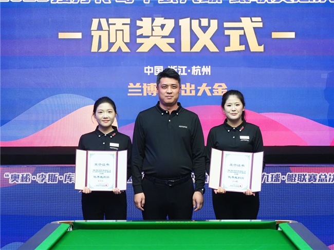 赛事的顺利进行离不开裁判员的公正执裁,王玲玲和田海霞获优秀裁判员奖项,独牙传奇中式九球鲲联赛副裁判长刘东来为他们颁奖并合影留念,以此感谢所有裁判员在赛事中的辛勤付出与专业坚守。