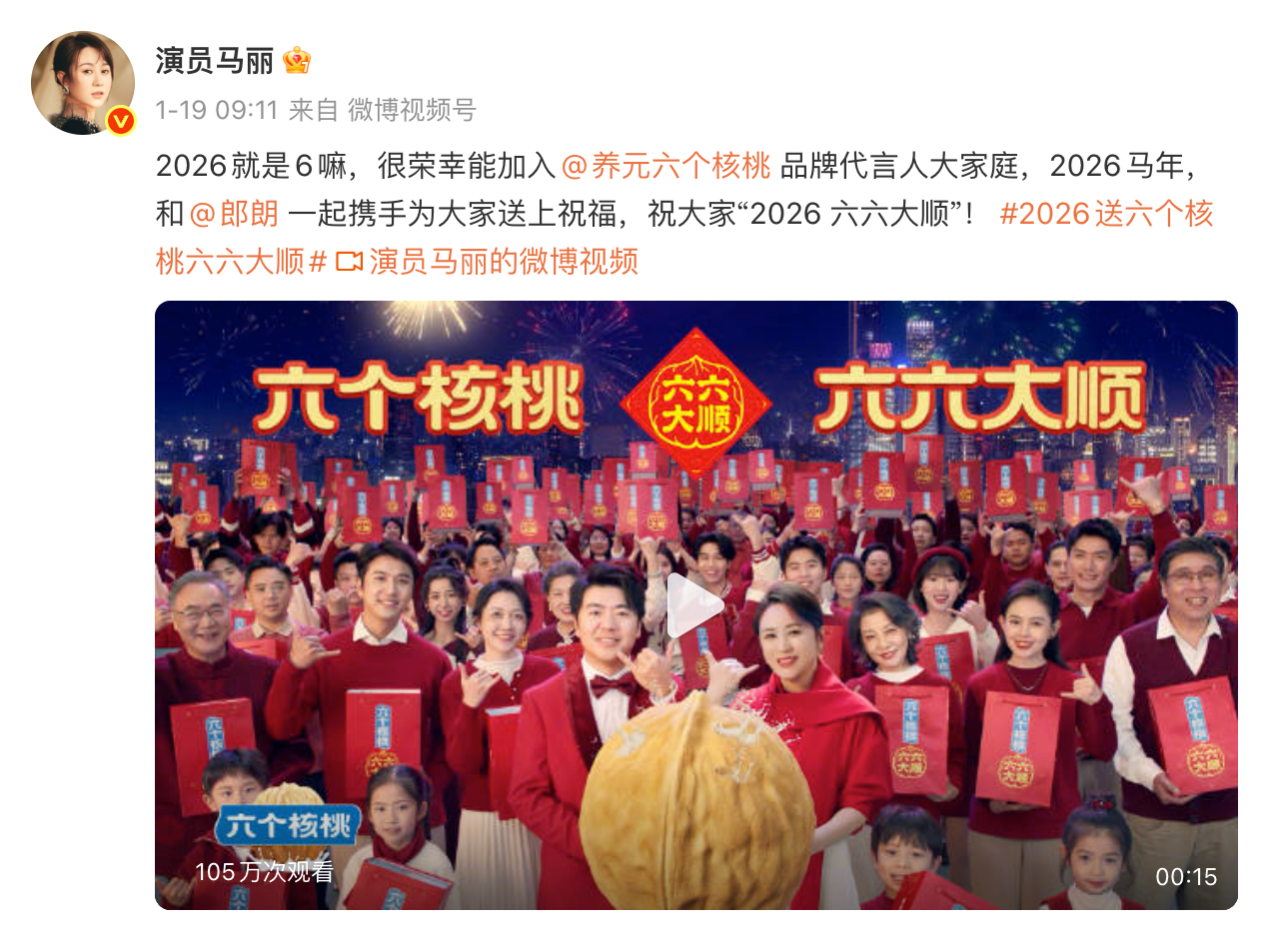 新春序启,福马送祥。在丙午马年将至之际,养元饮品旗下六个核桃正式官宣双代言人阵容——国民喜剧演员马丽与国际钢琴大师郎朗携手加盟,为消费者献上“2026就要六六大顺”的马年祝福。作为春节礼品市场王者,六个核桃长期稳居各大榜单前列,从“经常用脑,多喝六个核桃”到“六六大顺”,六个核桃不断通过深耕品牌文化建设与经营,为新年添彩纳福。