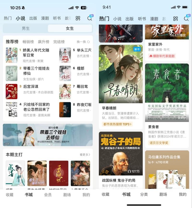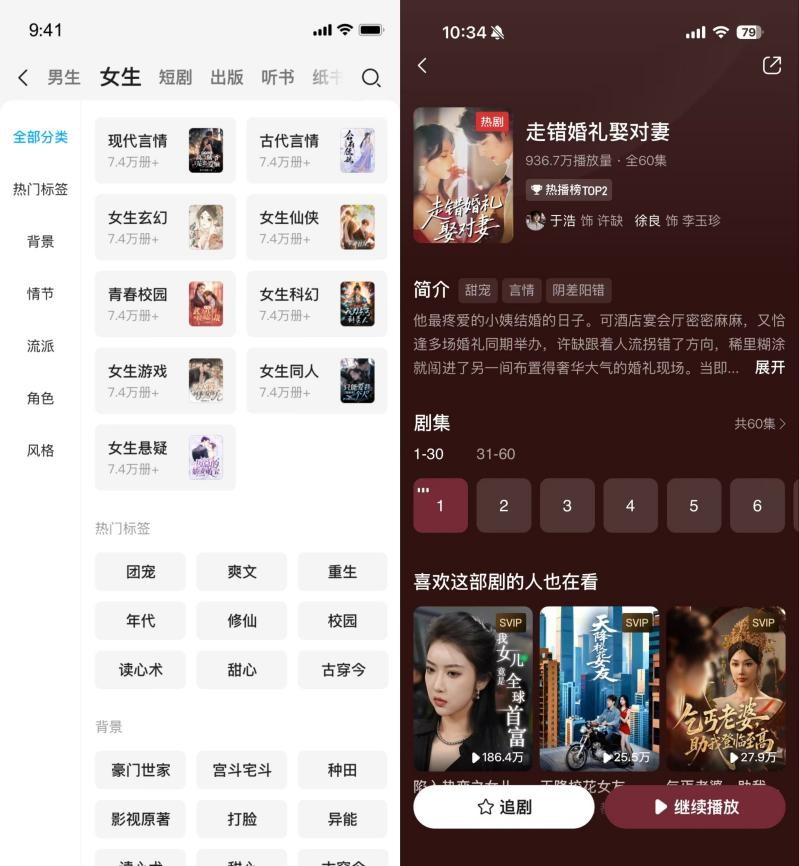 全新客户端构建 “书城”“剧场” 双频道,并于“书城”频道采用双瀑布流展示模式,将海量图书与精品微短剧可视化同步呈现,用户滑动间即可实现文剧场景无缝切换。