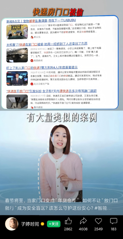近段时间,全国多地频发的“快递放门口被偷”事件,引发了公众对家门口财物安全的普遍焦虑。从杭州王女士耗时在二手平台“蹲守”追回被盗快递,到网友价值不菲的包裹在门前不翼而飞,此类事件暴露出当前家庭安防长期存在“内外割裂”的短板:门内智能设备日益完善,门外的快递、外卖等财物却常处于无人看管的“安防盲区”。