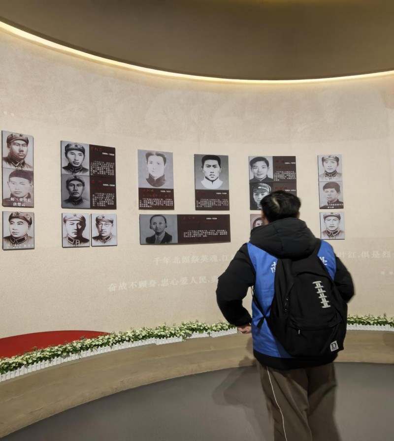 步入纪念馆主展馆,首先映入眼帘的是 “江海潮涌 红心向党” 主题序厅。巨大的弧形背景墙上,泛黄的历史照片与鲜红的党旗交相辉映,配合低沉激昂的解说声,瞬间将实践团成员带回那个风雨如晦却热血沸腾的年代。序厅中央,一座 “南通革命历程” 浮雕栩栩如生,从爱国志士的奔走呼号到解放军战士的胜利冲锋,一个个场景串联起南通革命的百年脉络,让成员们直观感受到革命先辈 “为有牺牲多壮志,敢教日月换新天” 的豪情壮志。