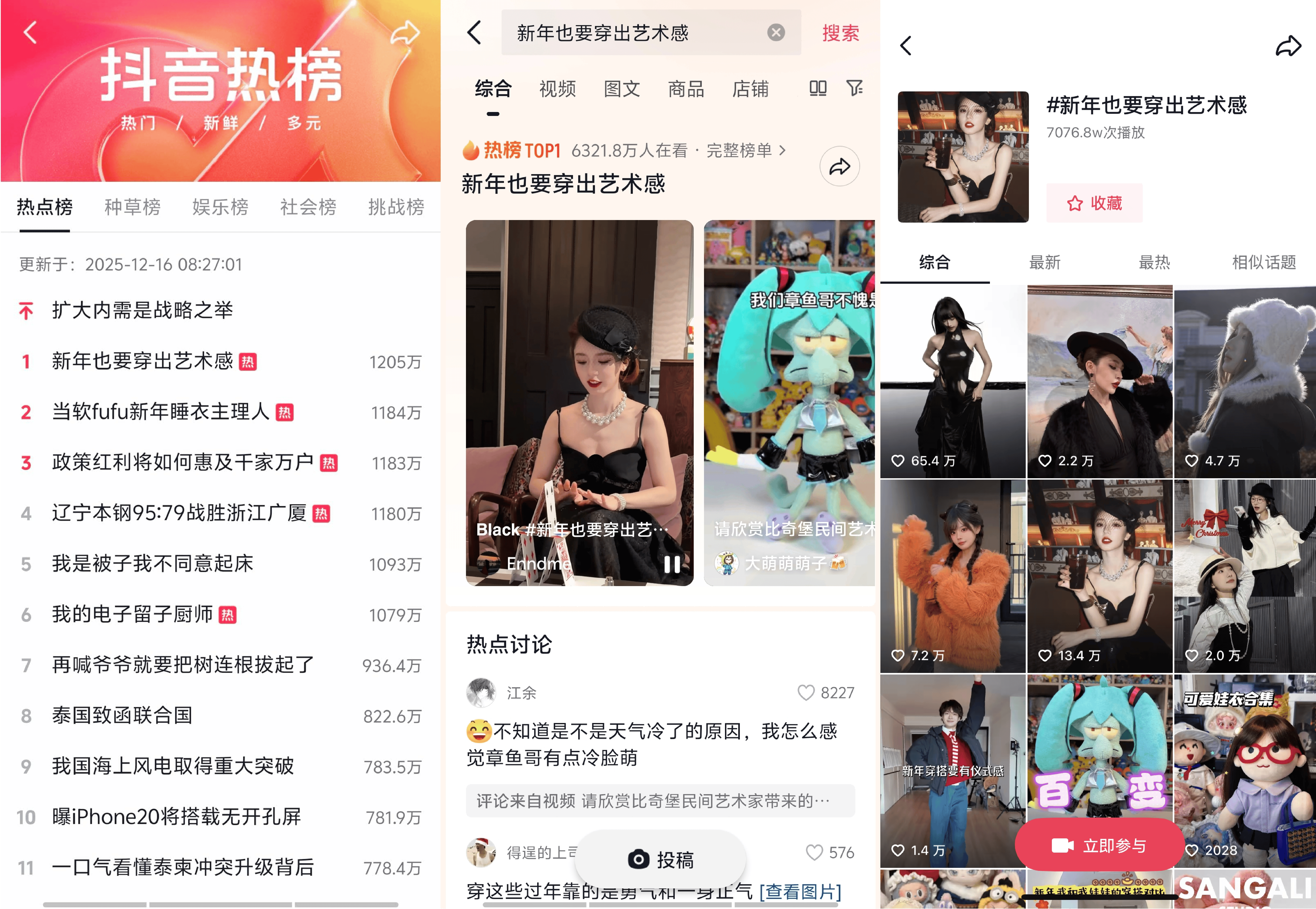 相关数据显示,#新年也要穿出艺术感 累计话题在线播放量高达7292.9万,累计作品数超9千条,共创热点于12月16日登顶热榜TOP1,当日话题热度达1205万,带动4.9万人在线讨论。