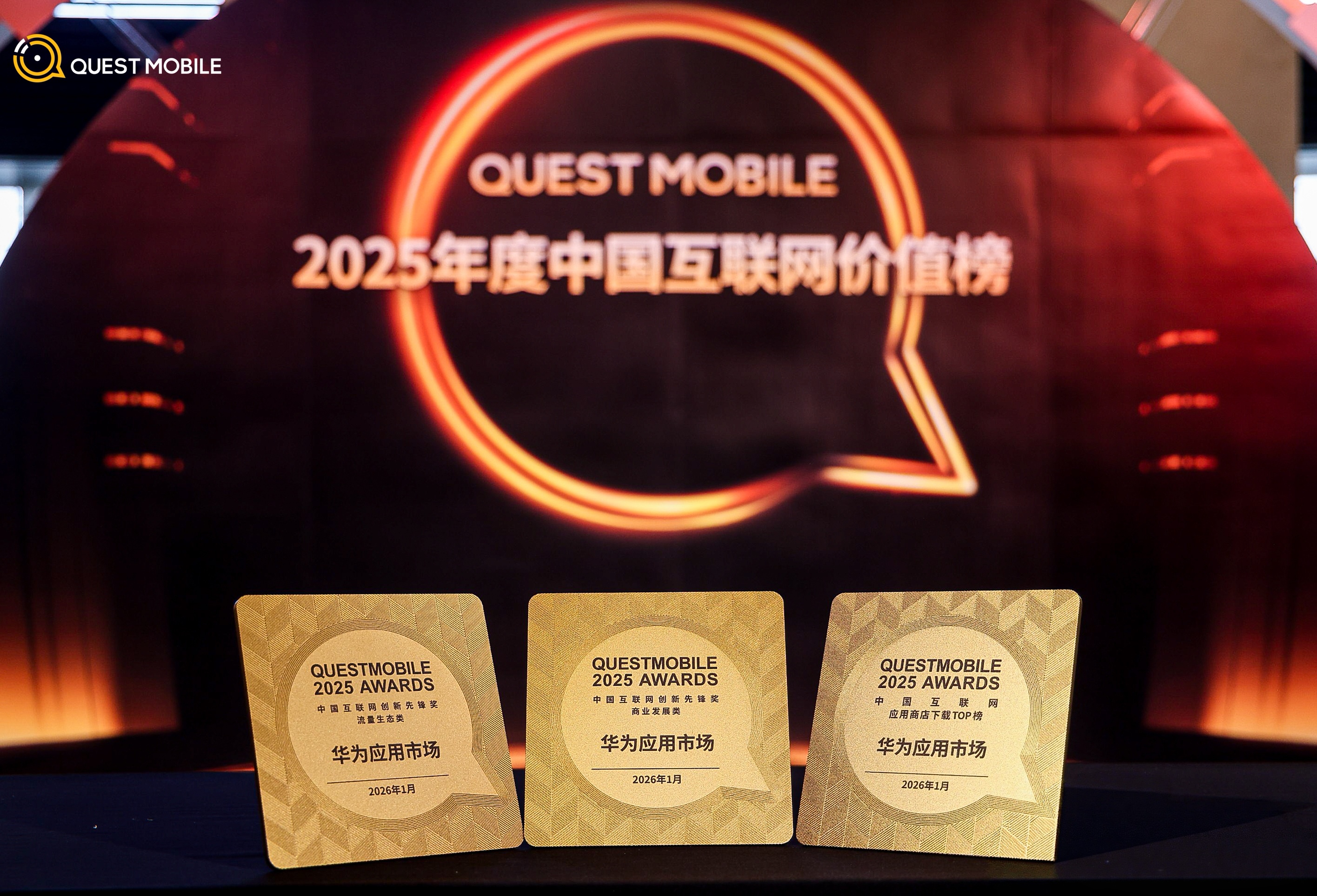 1月30日,QuestMobile“数聚共生・智算未来”2025年度趋势发布暨颁奖晚宴在北京举行。活动聚焦行业趋势与增长路径研讨,并揭晓了“中国移动互联网2025年价值榜”。华为应用市场凭借在用户服务、流量生态与商业运营上的突出表现,一举斩获“应用商店下载榜-TOP1”“2025中国互联网创新先锋奖-流量生态类”“2025中国互联网创新先锋奖-商业发展类”三项重磅荣誉,夯实其应用分发领域的标杆地位。