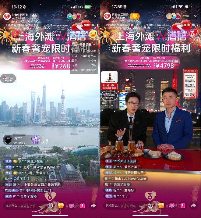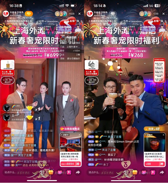 直播过程中,上海外滩W酒店各部门的负责人纷纷不定时空降,让直播间从单一的客房展示转向全场景生活方式渗透,大大激活了目标人群的“酒店”消费欲望。比如上海外滩W酒店的中餐行政总厨 Alan Li 为大家制作了新年创意料理,房务总监Wayne从专业视角给不同人群介绍特色房间,首席调酒师 Simon Wei也展示了W特色鸡尾酒的制作。这次直播是一场关于都市节奏、设计美学与云端体验的深度对话,抖音生活服务携手万豪集团旗下酒店正在定义新的品质生活,期待BOSS直播间以上海外滩W酒店为潮流地标的圆心,持续带领消费者一起探索全国酒店特色服务。