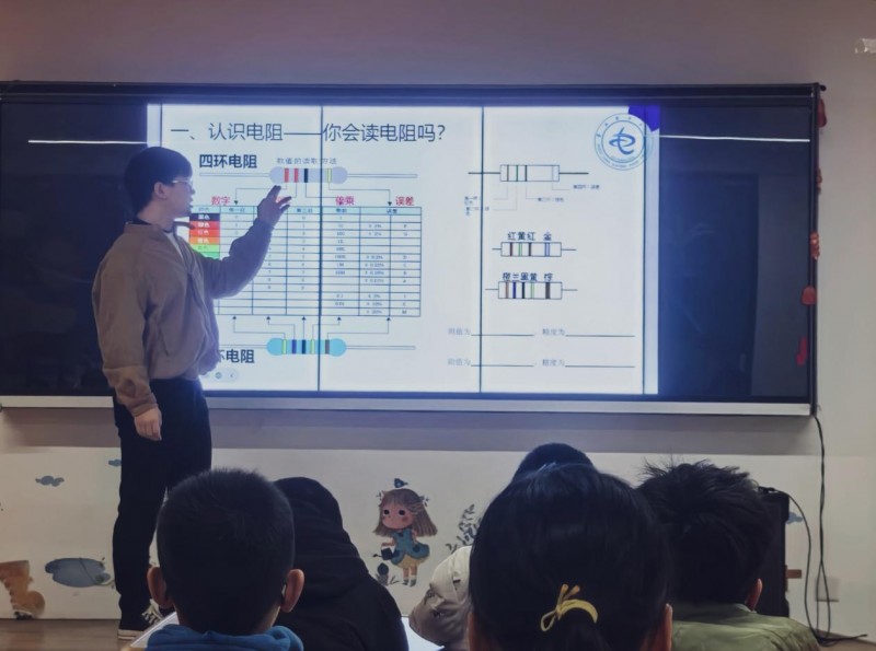 在此基础上,志愿者们重点讲解了色环电阻的识别方法,详细讲解了四环、五环电阻的颜色顺序与阻值含义,通过颜色对应数字的趣味记忆法,帮助孩子们快速掌握电阻阻值的读取技巧。同时,志愿者们还对发光二极管的结构特点、工作条件及常见应用场景进行了简要说明,进一步拓展了孩子们对电子元件实际用途的认识。