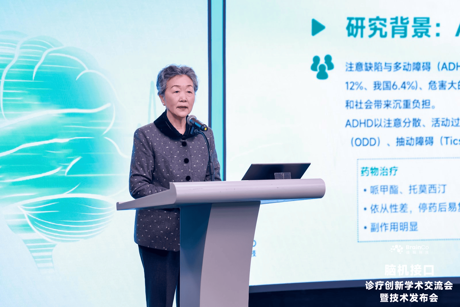 在探讨脑机接口技术的医疗应用后,会议聚焦到注意缺陷与多动障碍(ADHD)这一高发的儿童神经发育障碍问题上。中国发育行为儿科学创建人、上海交通大学医学院附属上海儿童医学中心终身教授金星明以“ADHD诊疗领域脑机接口技术的最新应用”为题,系统介绍了注意缺陷和多动障碍的诊疗现状。她指出,ADHD 是高发但可干预的神经发育障碍类疾病,单一药物治疗存在现实局限,而非侵入式脑机接口技术作为一种非药物手段,可通过趣味化、可视化的神经反馈训练改善注意力、自控力和执行功能。基于严格诊断标准和三组对照研究结果,她强调脑机接口与药物联合应用在症状改善和功能恢复方面效果显著,且脑机接口技术对6–7岁低龄儿童表现出更好的干预效果。同时,她认为脑机接口有望从疾病治疗进一步延伸至问题儿童和学前阶段儿童的功能训练,在综合干预、早期预防和儿童发展支持中发挥更大价值。