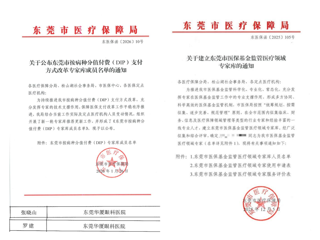 近日,东莞市医疗保障局发布《关于建立东莞市医保基金监管医疗领域专家库的通知》,东莞华厦眼科张晓山院长、罗建院长凭借其在医保支付方式改革与基金监管领域的深厚积累,被评为东莞市DIP支付方式改革专家库成员、东莞市医保基金监管医疗领域专家库成员。