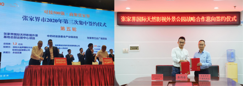 ▲张家界国际天然影视外景公园总部运营基地项目在市委市政府主要领导见证下正式签约