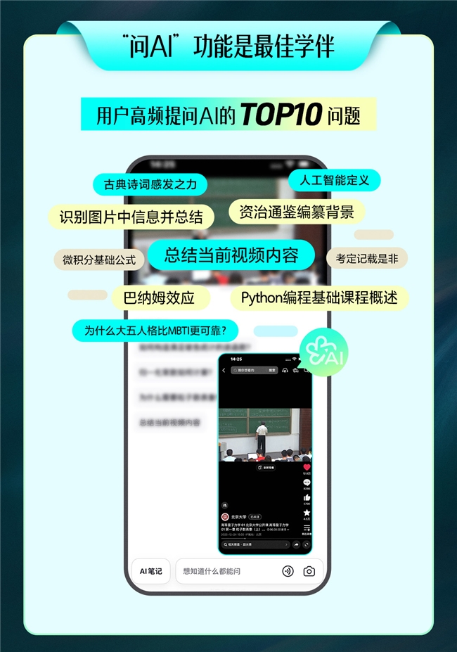 用户在抖音精选观看高校公开课时,点击屏幕右上方的“问AI”图标,即可就视频中的相关知识点进行提问。此时,公开课视频会与“问AI”同屏呈现,用户可边观看视频边通过AI学习。报告显示,“总结当前视频内容”“识别图片中的信息并总结”“资治通鉴编纂背景”“微积分基础公式”等成为用户提问AI频率最高的问题。