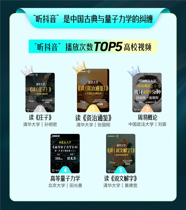 “听抖音”功能则可以解放双眼,实现后台播放,支持用户在进行其他活动时学习。报告显示,《读〈资治通鉴〉》《读〈庄子〉》《周易概论》《高等量子力学》《读〈说文解字〉》成为“听抖音”播放次数最多的五大高校公开课。其中,由清华大学张国刚讲授的《读〈资治通鉴〉》同时位列完播人数最多的公开课第五名。