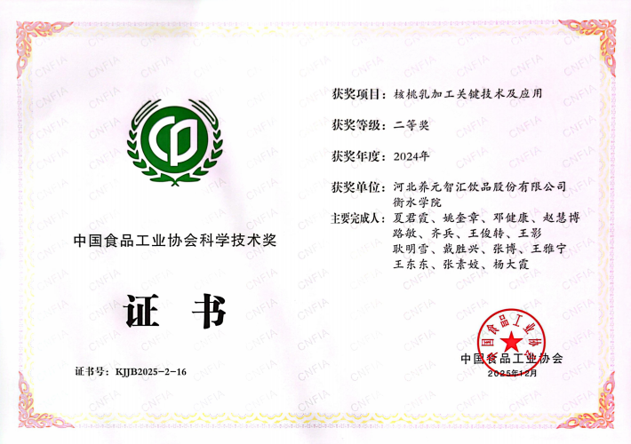 近日,河北养元智汇饮品股份有限公司(以下简称“六个核桃”)与衡水学院联合完成的《核桃乳加工关键技术及应用》项目,荣获中国食品工业协会科学技术奖二等奖。这一奖项的获得,不仅是对六个核桃长期以来坚持科技创新的高度认可,也标志着其在核桃精深加工领域的研发实力已居于行业前沿,持续引领产业向高标准、高附加值方向迈进。