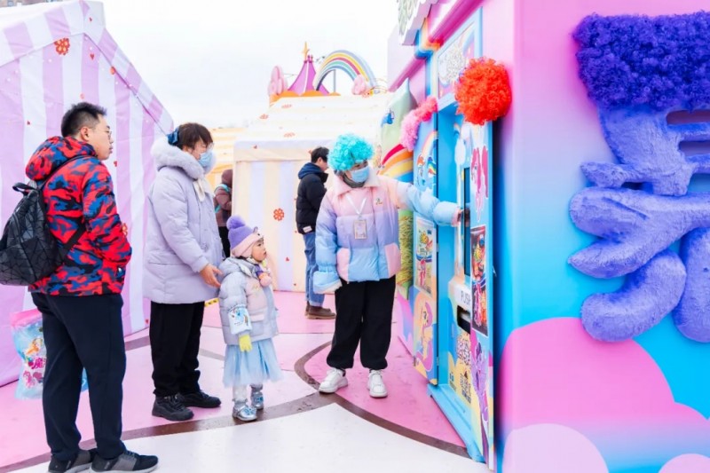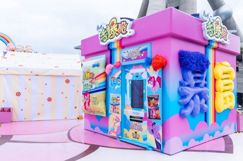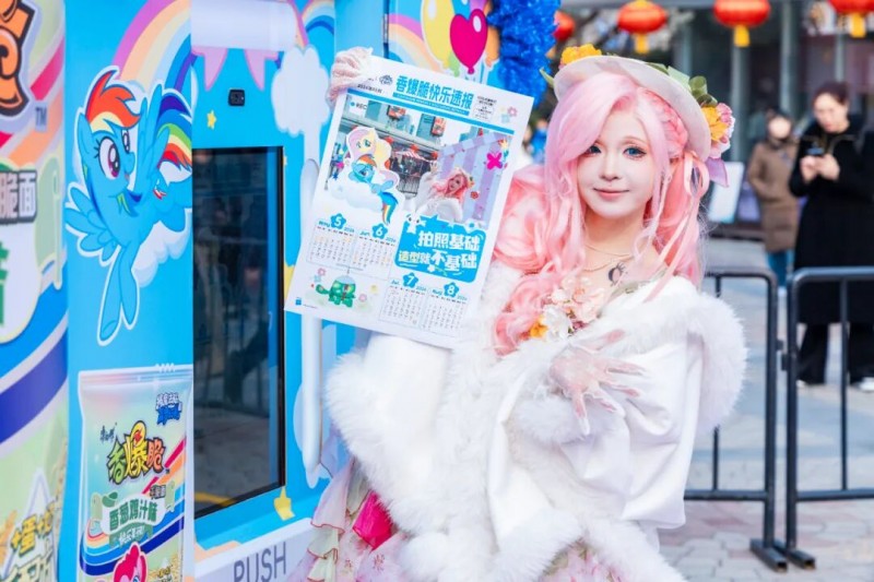基于上述前提,2月6日起康师傅香爆脆携手小马宝莉在上海东方明珠塔下打造的“友谊魔法新春花园”,更像是一个沉浸式的体验场。通过主题装置、Cosplay魔法快闪、全员“爆炸头”造型等细节,配合魔法贴纸的持续收集机制、与顶级 IP 的长期世界观绑定,这些借鉴了游戏与社群运营的设计,使得消费者从一个购买者,转化为一段魔法叙事的“持续参与者”。