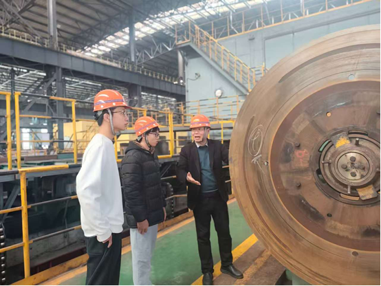 实践团队深入轧钢车间,在高温与机械噪声的环境下,实地观察并记录了钢锯片的结构、材料及其性能参数。学生们跟随技术人员的讲解,逐步梳理更换流程,尝试结合课程知识,初步分析人工操作中可优化的动作路径。交流环节,团队成员与企业技术员进行多轮交流,收集了关于现有换片设备稳定性、常见故障模式、安全风险点以及自动化改造的具体需求。过程中,团队成员主动协助整理设备点检记录,体验了企业日常维护管理的标准化流程。“课本上的传动比、精度计算突然在眼前轰鸣的轧机中变得具体,但也更复杂。现场的温度、振动、磨损,都是我们在实验室里从未模拟过的变量。”一位实践队员在笔记本上写道。