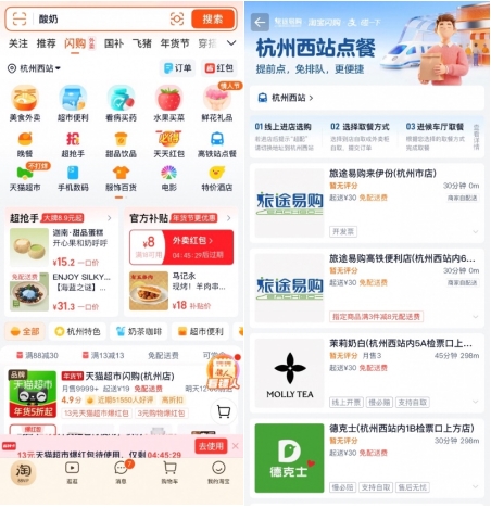 据悉,这是淘宝闪购联合旅途易购在年前联合推出的“高铁站点餐”服务。旅客无论在哪,只需打开淘宝APP或支付宝APP,并将淘宝闪购的收货地址选择为特定站点,即可在进入“高铁站点餐”频道。