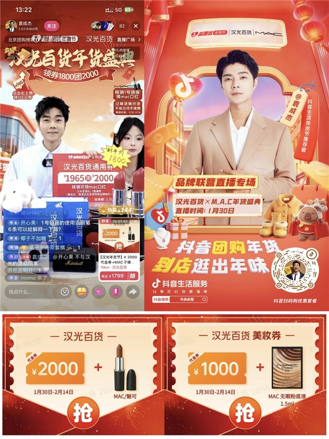 营销玩法不设限,创新更是流量密码。北京核心商圈汉光百货 以“年货盛典”为主题,与平台深度合作,打造北方重点城市中首个“国际美妆+综合商场+明星达人”的联营直播模式,整合多方优质资源。汉光联合 M.A.C 等国际美妆品牌推出专属年味货盘及福袋,贴合北方消费者新春置妆礼赠需求,邀请明星袁成杰打造沉浸式直播。从12月通过西城消费券激活商家,到1月建立平台信任后加大运营投入力度,扫码价值带动三天核销突破700万,后续借品牌、艺人资源撬动直播大场,单场支付超百万,实现声量与销量双突破。