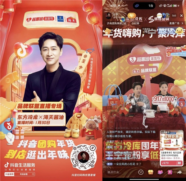 区域连锁商超东方冷库 携手国民品牌海天酱油,打造北方地区年味专场直播,精准覆盖区域年货调味品需求。1月30日王宁明星专场单场交易突破500万,东方冷库1月整体交易超千万、创历史新高,成为商超与快消品牌合作的标杆案例。