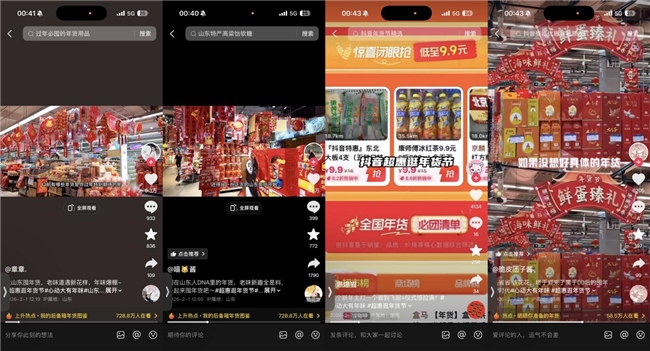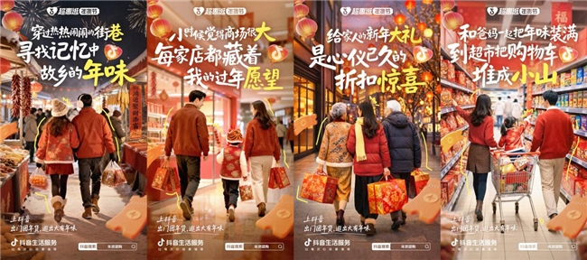 线上通过多维内容造势,引爆全域流量。 基于北方用户新春情感需求,设计“北方办年货的专属记忆”等系列年味情绪海报,通过抖音站内等渠道精准投放,强化活动认知。