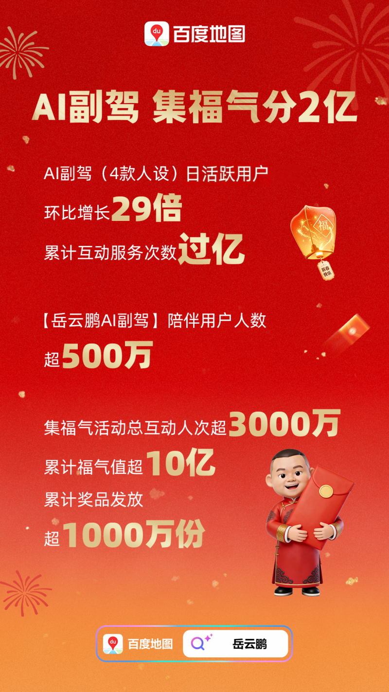2026 年 2 月 18 日,百度地图公布春节出行场景中的亮眼成绩单。作为 2026天津卫视相声春晚独家特约合作伙伴,百度地图借势晚会舞台完成代言人岳云鹏对口相声深度创意植入,全新上线的 “岳云鹏文心AI副驾”同步亮相。这场 “科技 + 欢笑 + 福利” 的新春盛宴,不仅斩获观众关注,更在春节出行场景中交出亮眼成绩单 —— 累计陪伴用户超 500 万、累计互动服务次数过亿,成为马年出行的 “顶流搭子”。
