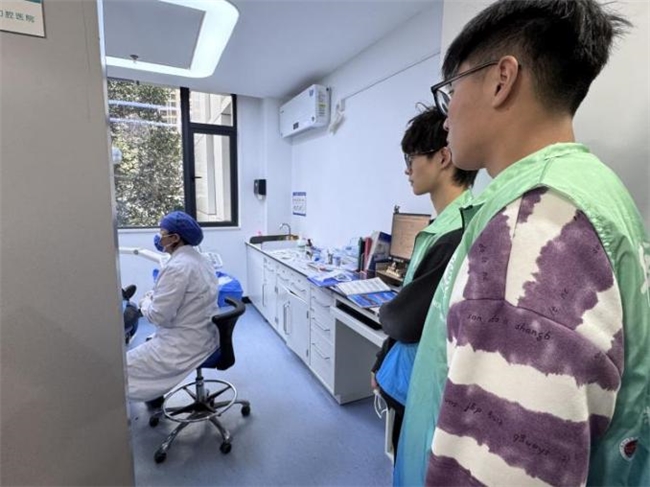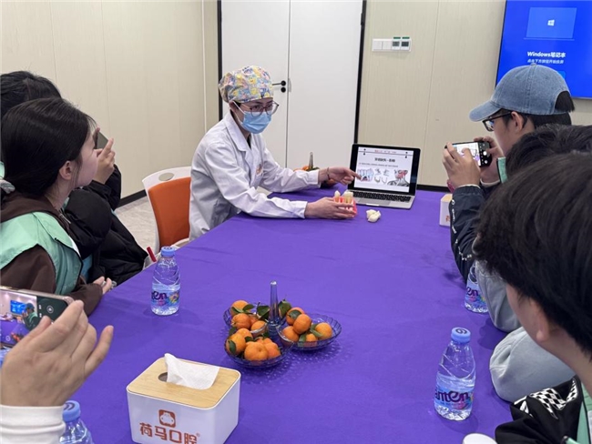 2月10日,在宁德荷马口腔旗舰店,实践队首先走进企业文化展示区,一幅幅照片勾勒出民营口腔机构扎根基层、服务县域的成长轨迹。在种植牙科普环节,技术主任借助3D模型拆解种植体结构与手术流程,将“钛基材料”“表面改性”等实验室术语转化为生动的临床语言。随后的模拟诊室体验中,队员们在医师指导下进行基础口腔检查操作。