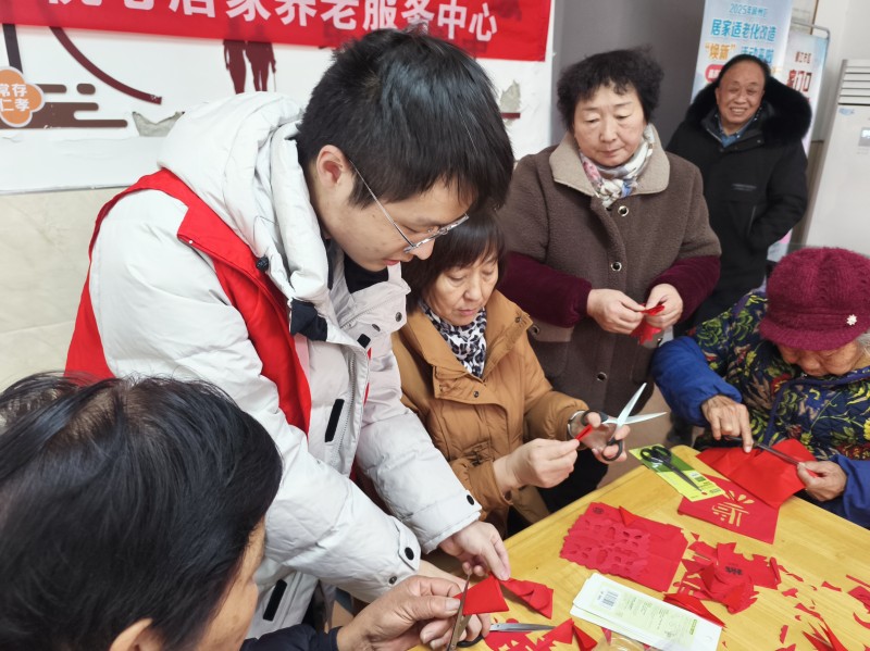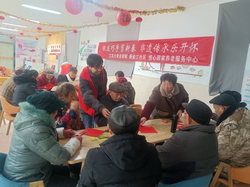 为传承中华优秀非物质文化遗产,丰富社区老年群体精神文化生活,推动高校志愿服务与社区养老服务深度融合,2026年1月6日,江苏大学法学院青年志愿者协会携手镇江市新金江社区悦心居家养老服务中心,开展“银发巧手剪新春,非遗传承乐开怀”主题剪纸实践活动,二十余名社区老人参与活动,在指尖创作中感受非遗魅力,共迎新春佳节。新金江社区悦心居家养老服务中心工作人员与法学院青志协志愿者全程参与并保障活动开展。