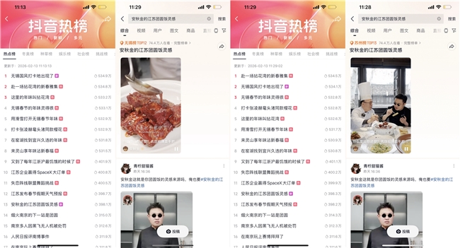 其中,已于2月7日发布的苏州城市团圆饭视频内容,截至目前播放量已超216万次,评论互动量超9万。视频发布后,带动“松鹤楼”搜索PV环比增长17.16%,苏州城市“年夜饭”搜索PV环比增长15.91%。同时,该视频还入选抖音精选视频,热点话题#用正统年味给邪修上一课 最高冲至全国榜TOP1;2月12日发布的无锡城市团圆饭内容,热点话题 #安秋金的江苏团圆饭灵感 登上苏州和无锡两地同城榜单,最高冲至同城榜TOP1,视频点赞量已超过15.2万,不少网友都在评论区晒出自己家过年才会吃的压轴美味。