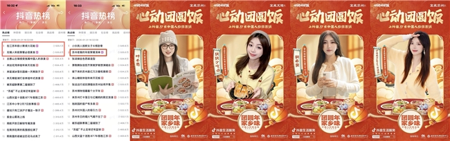 在无锡与苏州,抖音生活服务围绕两座城市的地标及特色美食,将目标城市本土文化与“心动团圆饭”巧妙融合,实现深入人心的宣传效果,有效提升所在城市团圆饭等相关词条的搜索量。