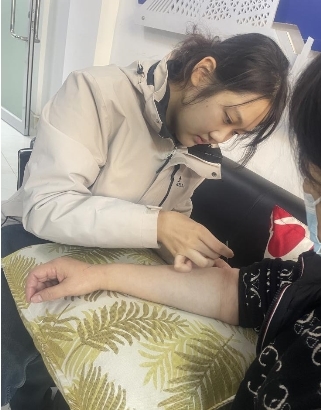 急救知识宣传区,队员手把手教居民操作海姆立克急救法,针对婴幼儿与成人不同体 位分别演示,引得大爷大妈们纷纷上手体验。中医特色体验区最为火爆,推拿按 摩、耳穴压豆、针刺项目前排起长队,队员边施治边讲解足三里、合谷等常用保健穴位的定位与按压技巧。健康咨询台前,队员们为居民测量血压、血糖,,并现场建立“社区健康服务联系点”微信群,承诺定期推送养生知识,实现服务常态化。