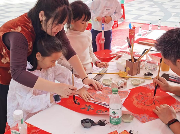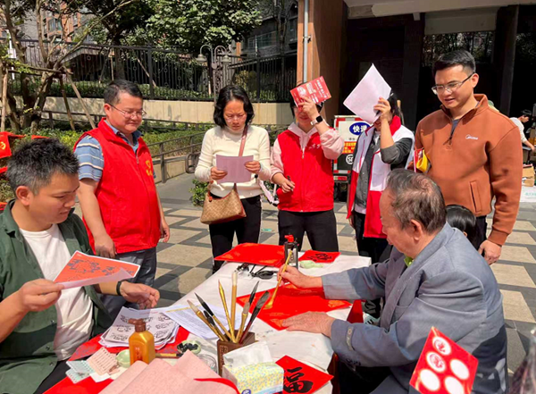 “翰墨迎春坊”成为当日最具人气与情感共鸣的服务阵地。书法名家与社区爱好者挥毫泼墨,一副副寓意吉祥的春联、一个个“福”字在笔尖诞生,浓浓的年味与文化气息在现场弥漫。居民们或领取通用祝福,或定制个性化内容,尤其是亲子体验区,孩子们在认真描摹,欢声笑语不断。这里不仅送出了上千份新春祝福,更成为了促进社区文化交流、增进邻里和谐的情感纽带。