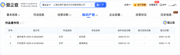 爱企查App显示,邵艺辉全资持股上海红拂不复还文化传媒有限公司1家企业,并担任该公司的法定代表人、股东、董事。作品著作权显示,该公司已为《好东西》、《爱情神话》登记著作权,作品类别为文字。