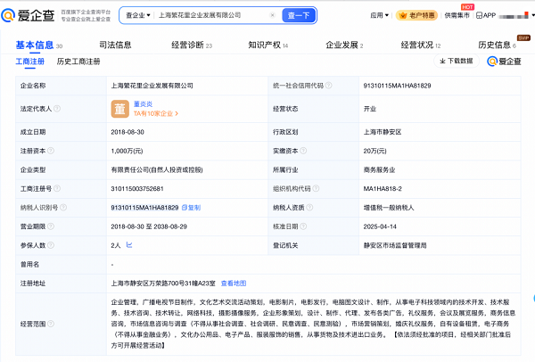 爱企查App显示,辛芷蕾经纪公司——上海繁花里企业发展有限公司成立于2018年8月,注册资本1000万元,知识产权信息显示,其作为电视剧《繁花》的出品方之一,目前已申请注册繁花商标。