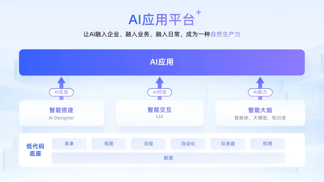 智能搭建,彻底改变软件生产方式。用户只需用自然语言描述需求,AI即可在几分钟内自动生成包含表单、流程、报表、看板的生产级应用。智能交互,彻底重构用户体验。用户只需要发送指令,LUI支撑系统自动检索数据、阅读纪要、提炼关键信息并给出行动建议,此外系统还能根据指令自动弹出新建跟进记录卡片,并建议更新商机状态。