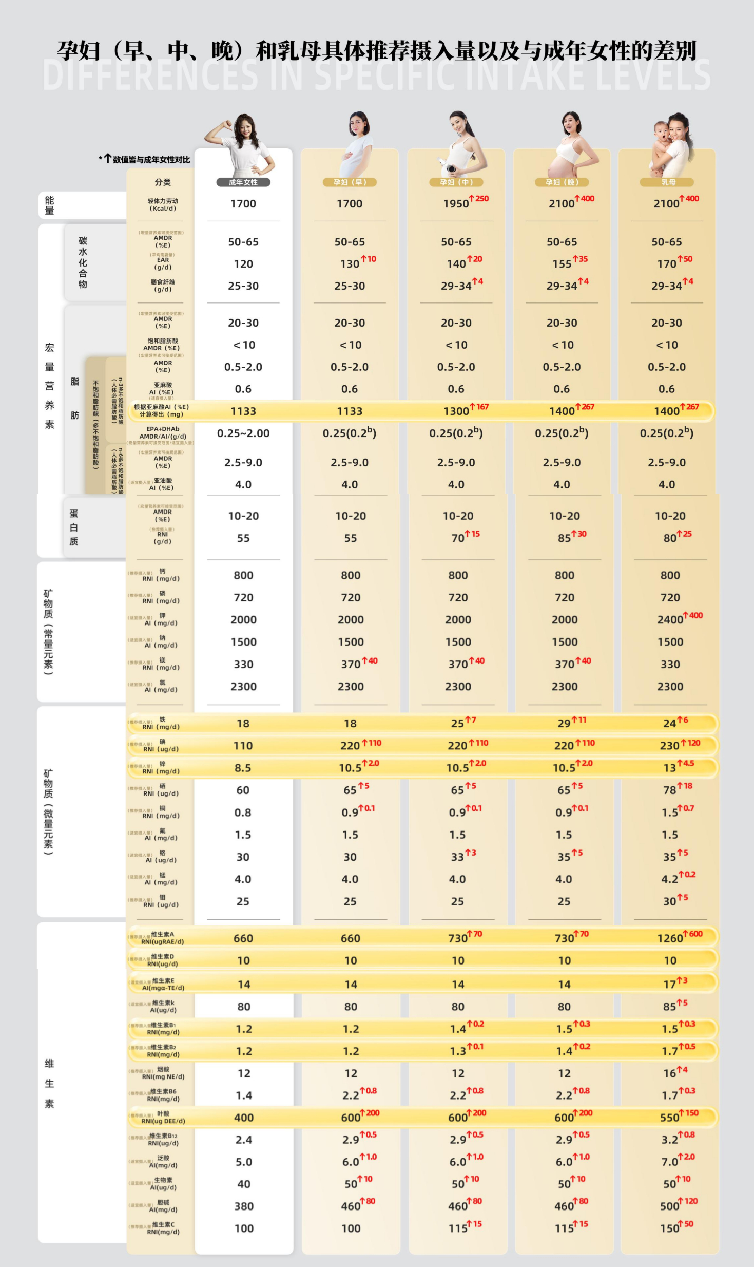 与普通女性相比,孕产妇对关键营养素的需求显著提升。以α-亚麻酸为例,孕期推荐摄入量从1133mg上升至1133~1400mg,且该营养素很难通过日常饮食足量获取,这也充分印证孕产妇专用营养素产品在怀孕期间的重要性。