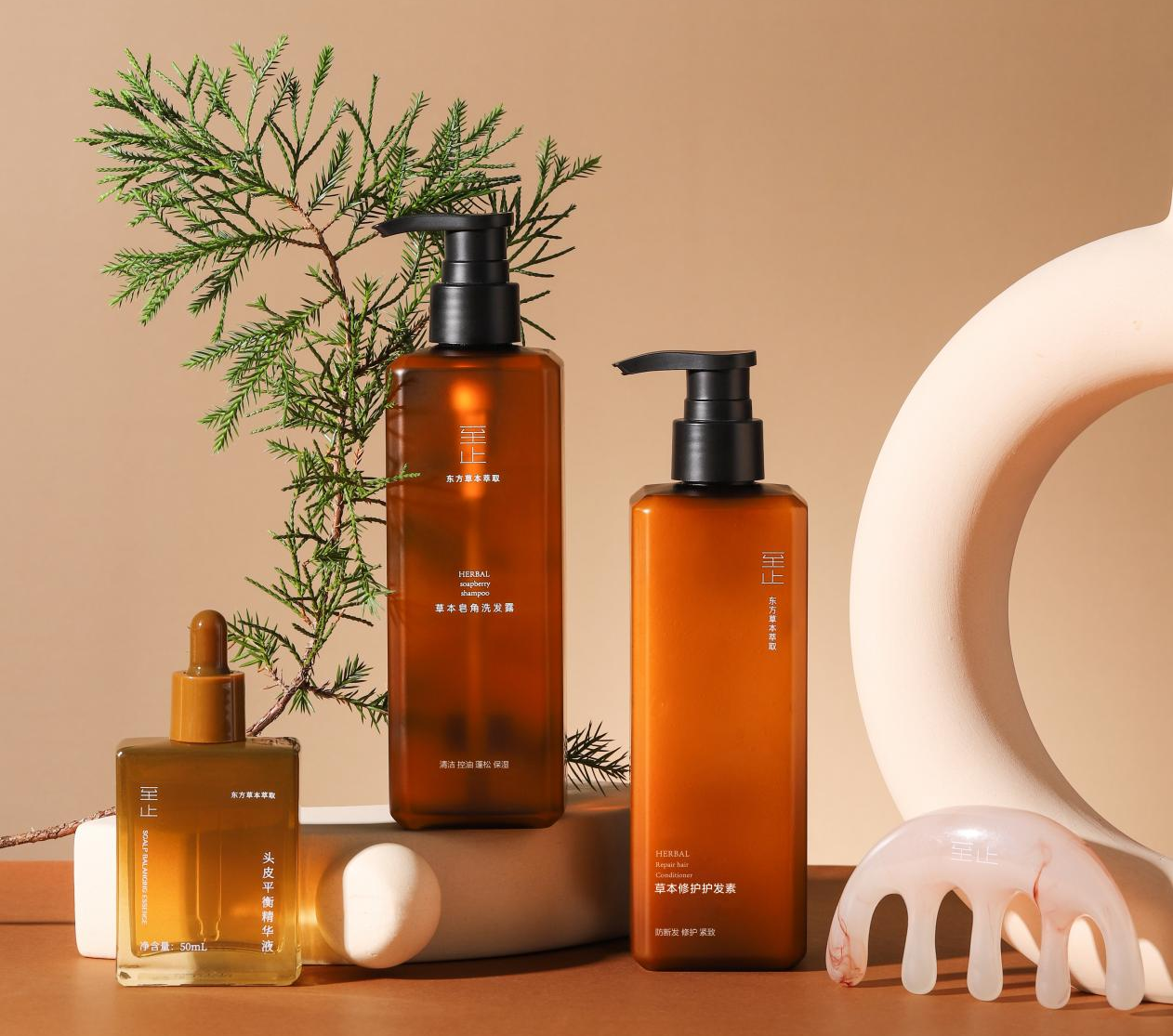 草本皂角洗发露,通过革新氨基酸配方,融合灵芝与桦树茸发酵专利成分,调节头皮微生态,无月桂醇等刺激成分添加,全人群适用,油头不油,干发不干;草本修护护发素,毅然打破“护发素不得接触头皮”的行业教条,以可接触头皮的轻盈配方,实现“从头皮到发丝”全链路养护;头皮平衡精华液,采用独家定制的中药原料,并运用中医君臣佐使理论,融入足量侧柏叶,何首乌等植萃精华,采用连续制备酶切超低分子量透明质酸等专利技术,最大化中草药效果,实现舒缓、控油与紧致养护。