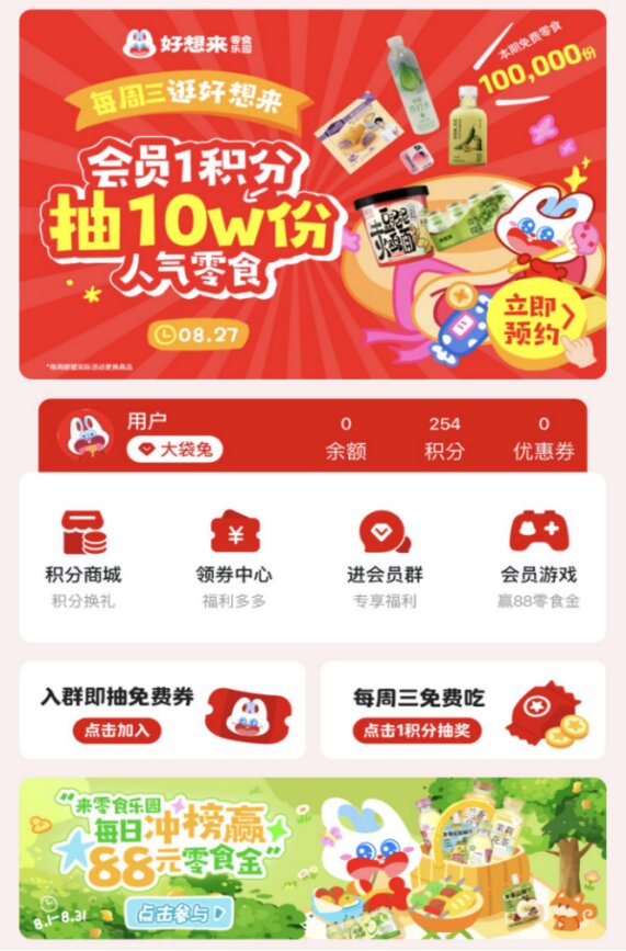 在会员精细化运营上,好想来构建了一个兼具广度与深度的会员运营体系,并持续探索创新。除了每月88会员日优惠、每周三积分日可用1个积分参与“人气零食抽奖”等常态化权益与活动,好想来还持续发力节点营销、撬动新客转化率。例如,今年9月,好想来推出国庆中秋双节会员活动,创新性地打造了 “会员成长任务”、“消费抽奖”等一系列趣味玩法,将福利激励深度融入用户旅程,13天时间吸引了近400万用户踊跃参与;今年年底,开启年货节系列会员活动,结合春节消费趋势特点,创新性推出“集五福抽汽车”、“好想来年度账单及零食人格测试”等活动,活动异常火爆。