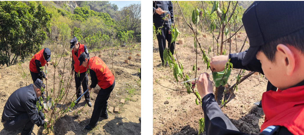 大家俯身修整树盘,反复压实土层,细心浇灌定根水,力求栽一棵、活一棵、植一片、成一景。经过一上午辛勤劳作,民警们顺利完成栽植任务,一棵棵新苗迎风挺立,为鲜花港增添盎然绿意。种植结束后,民警们还前往查看并养护前两年栽种的树木,见证绿色成长。