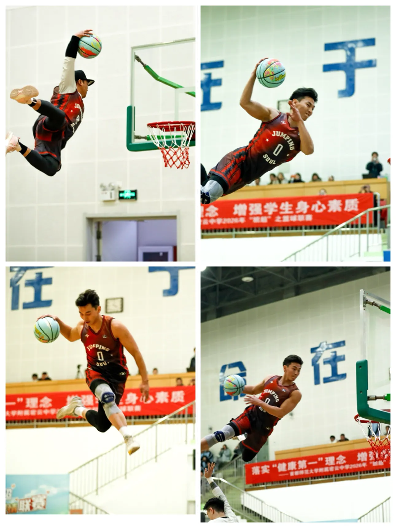 男篮赛事后,CBA扣篮大赛冠军张鼎岩与学校毕业的体育老师刘博同台亮相,展开友谊赛与联合扣篮表演。刘博的专业发挥与张鼎岩炸裂的扣篮动作,让师生近距离感受职业篮球的魅力,将现场氛围推向顶峰。