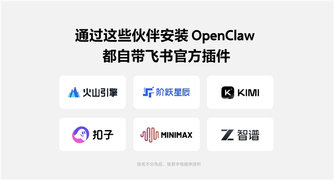 面向工程师,飞书开源并持续升级官方 OpenClaw 插件。该插件支持 OpenClaw 以用户身份操作云文档、多维表格及日程,实现与飞书工作流的深度融合。目前,火山引擎、阶跃星辰、Kimi、扣子、MiniMax、智谱等主流大模型与云服务厂商均已完成与飞书官方插件的对接。