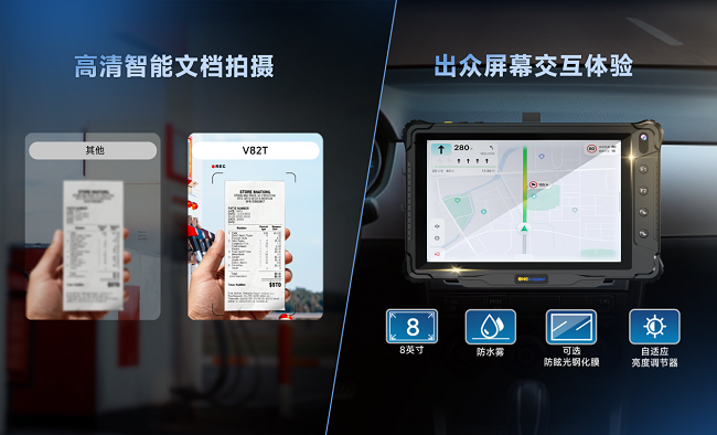 在物流运输领域,V82T作为车队管理的核心设备,通过与车载盒子及后台管理系统连接,实时显示车辆位置、速度及行驶轨迹,助力管理人员优化运输路线与调度方案。司机可通过V82T即时接收调度中心派发的订单任务,并直接调用导航规划路线,提升运输效率与服务品质。到达目的地后,利用1300万像素后置摄像头拍摄运单、签收单等文件,并迅速上传至车队管理系统,大幅提高数据录入与处理效率。