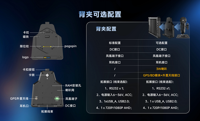V82T标配车载专用背夹,集成了RS232、AHD、USB 2.0等多种接口,可轻松连接车载盒子、AHD摄像头等外设,满足不同车型及车队管理需求。同时,背夹支持凤凰端子/DC/散线等多种供电方式,以及6-36V宽压输入及ACC点火自启功能,完美兼容多种车型的电源系统。增强型GNSS模块和外置SMA天线接口的加入,更是确保了复杂城市环境中的精准定位和导航。
