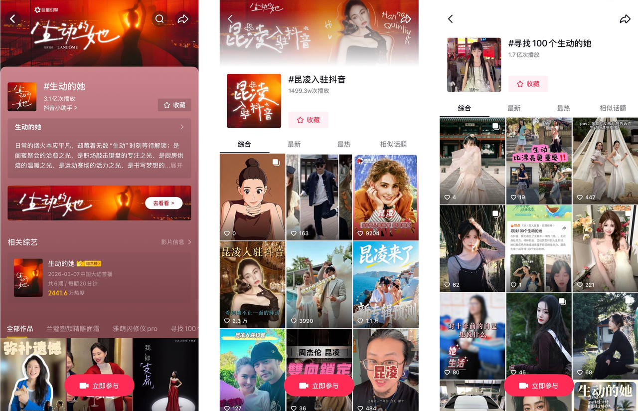3月7日周杰伦预告引发热议,3月8日当天昆凌正式入驻,话题登顶抖音娱乐榜TOP1;次日双人共创视频发布,再登热榜。明星真实自然的夫妻互动,为核心主题带来亿级曝光,更为「生动的她」增添情感注脚——明星不再是遥不可及的符号,而是“多面女性”的生动样本。