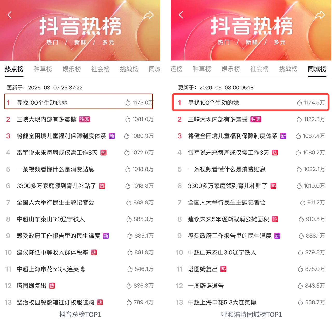 真实、无需修饰的日常记录,天然契合女性用户的表达欲,迅速点燃UGC创作热潮。超100位达人参与,累计产出高赞视频10个,话题斩获抖音热点榜TOP1。从“被看见”到“自我表达”,UGC让“生动”成为千千万万女性共同书写的集体叙事。