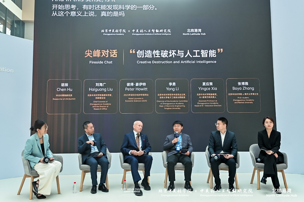 随后,在以“创造性破坏与人工智能”为主题的尖峰对话上,彼得·豪伊特教授与北京中关村学院首席科学家、科研部主任刘海广,北京中关村学院学术委员会主席、清华大学电子工程系长聘教授李勇,北京中关村学院副教授夏应策,北京中关村学院x南开大学博士生张博雅展开对话。本次论坛及对话环节,由中关村两院研究员胡辰主持。